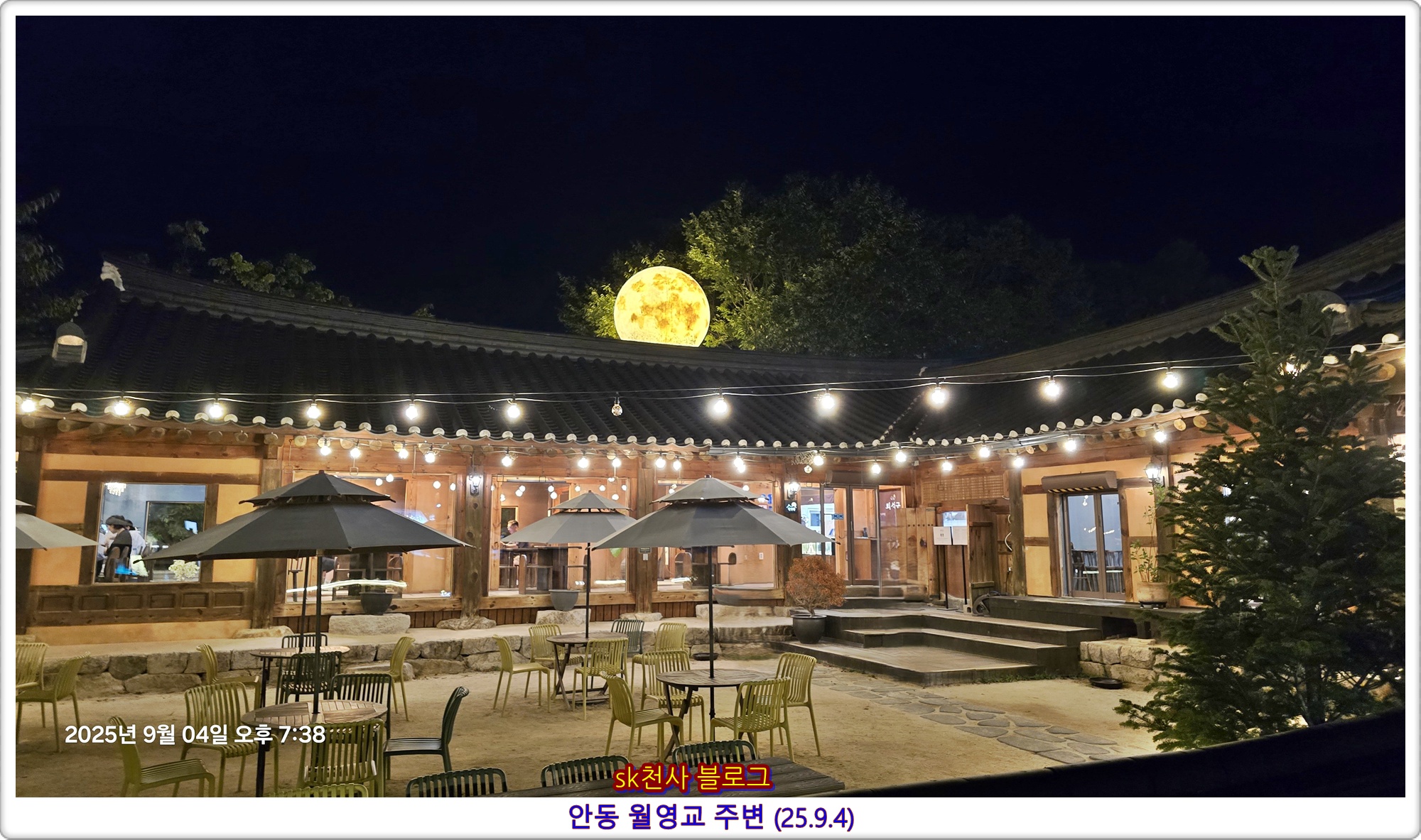↘ 안동시립박물관 주차장 주변 카페. 지붕 위에 달 조형물이 밤 풍경을 더욱 멋지게 해줍니다.