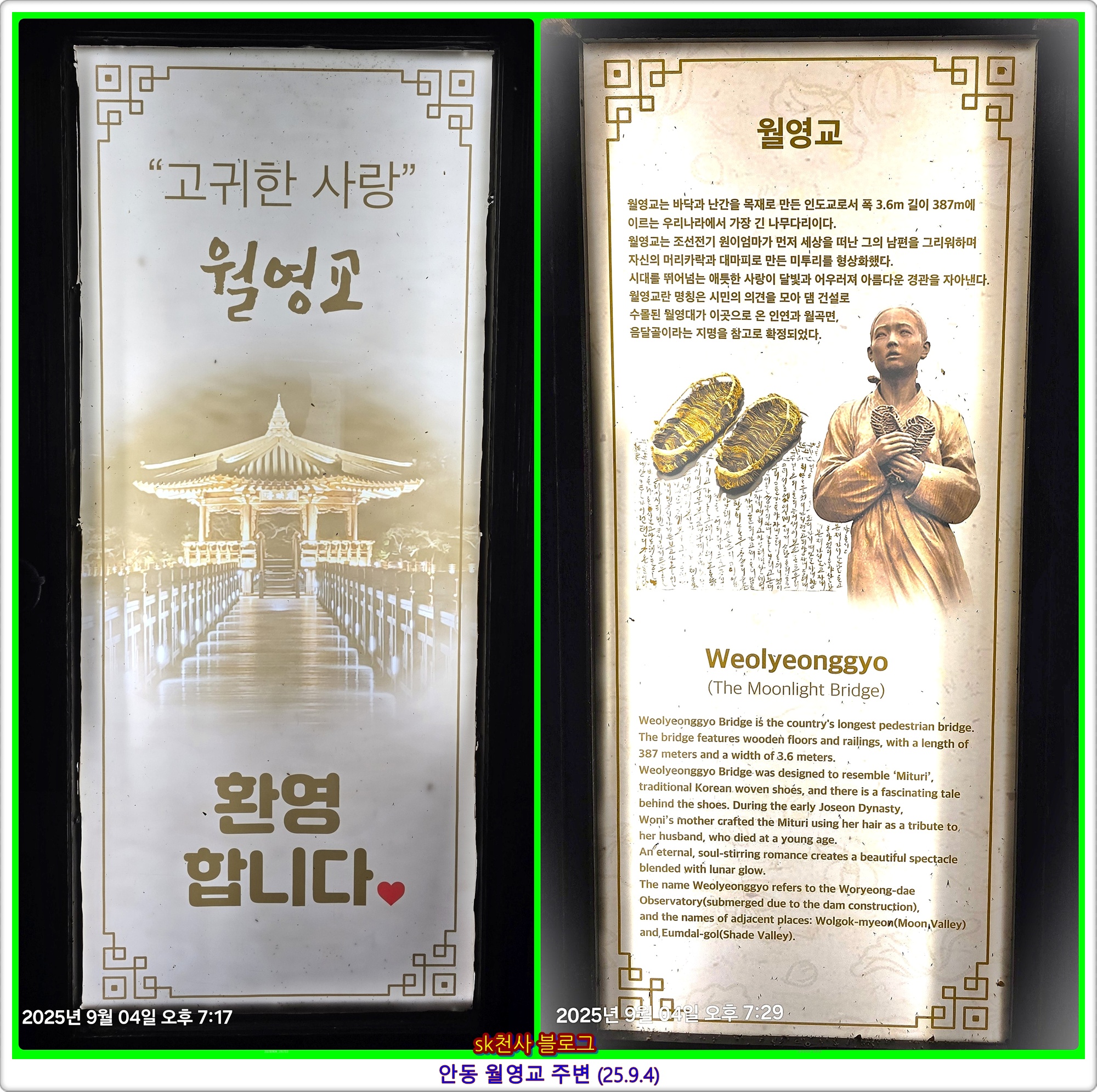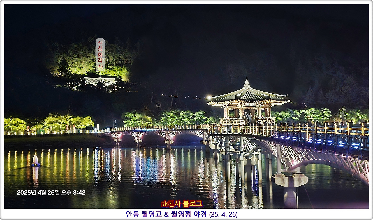 * 월영교(月映橋)는 안동댐 아래 낙동강 위에 놓인 다리로 우리나라에서 가장 긴 목책 인도교(폭 3.6m, 길이 387m)이고, 안동물문화관이 있는 상아동과 안동민속촌이 있는 성곡동을 연결하는 다리입니다. 특히 밤에는 다리의 조명이 강물에 비쳐 아름다운 야경을 연출하며, 한국관광공사가 선정한 '야간 관광 100선'에 선정된 곳입니다. 월령교에는 '원이 엄마의 편지'로 알려진 애절한 사랑 이야기가 담겨 있어 더욱 의미를 더하는 곳이기도 하답니다.