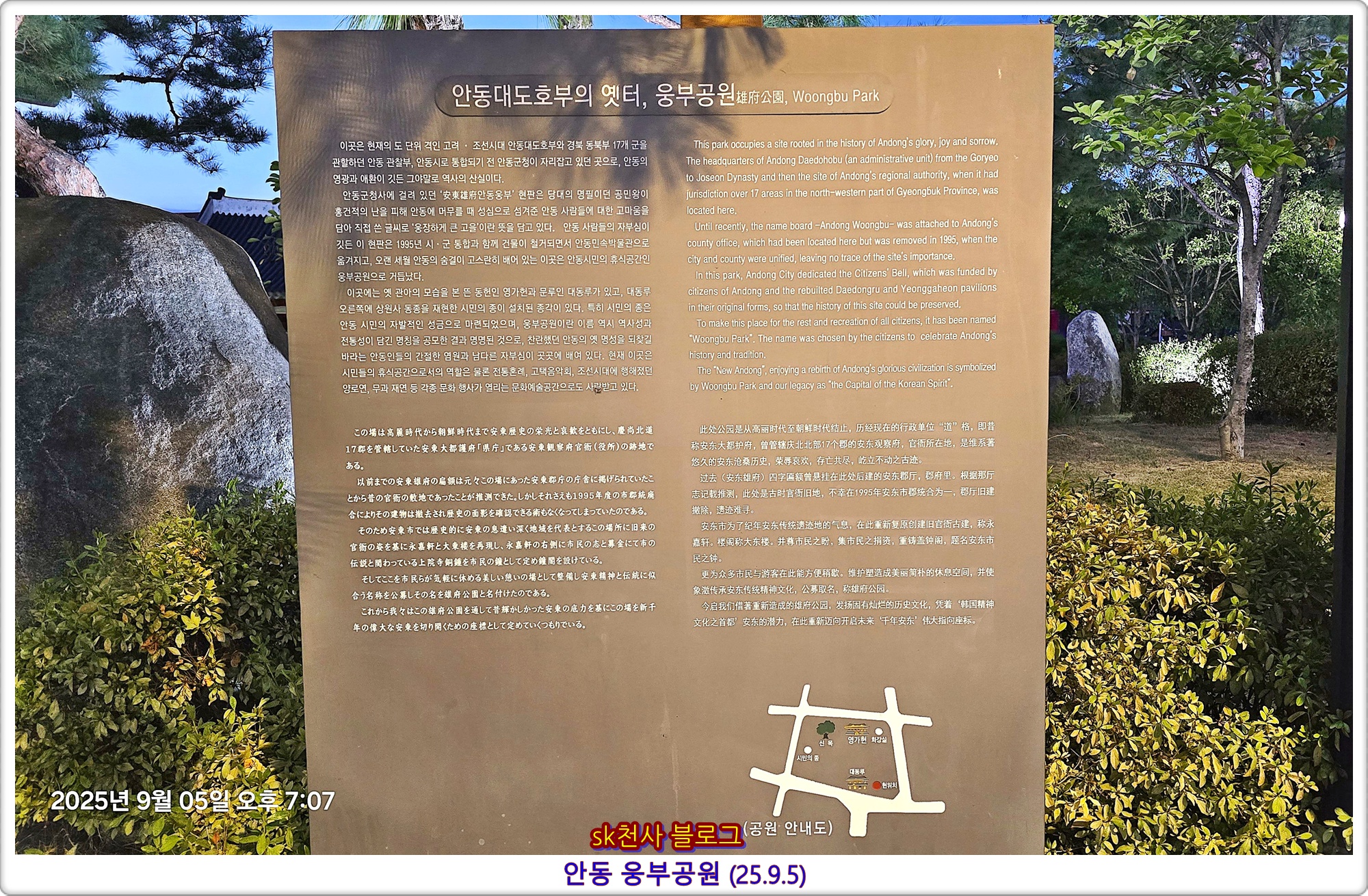 * 웅부공원(雄府公園)은 안동의 역사와 문화가 담긴 장소로, 시민들의 휴식 공간이자 다양한 문화 행사가 열리는 곳입니다. 고려시대부터 조선시대까지 안동대도호부의 청사가 있던 곳이며, 안동군청이 자리했던 유서 깊은 장소이기도 합니다. 1995년 안동시와 군이 통합되면서 안동군청 건물이 철거된 자리에 시민들의 휴식공간으로 웅부공원이 조성되었고, 공원의 주요시설은 옛 관아의 모습을 본뜬 영가헌과 문루인 대동루가 있고, 시민들의 성금으로 조성된 상원사 동종을 재현한 시민의 종이 있습니다.