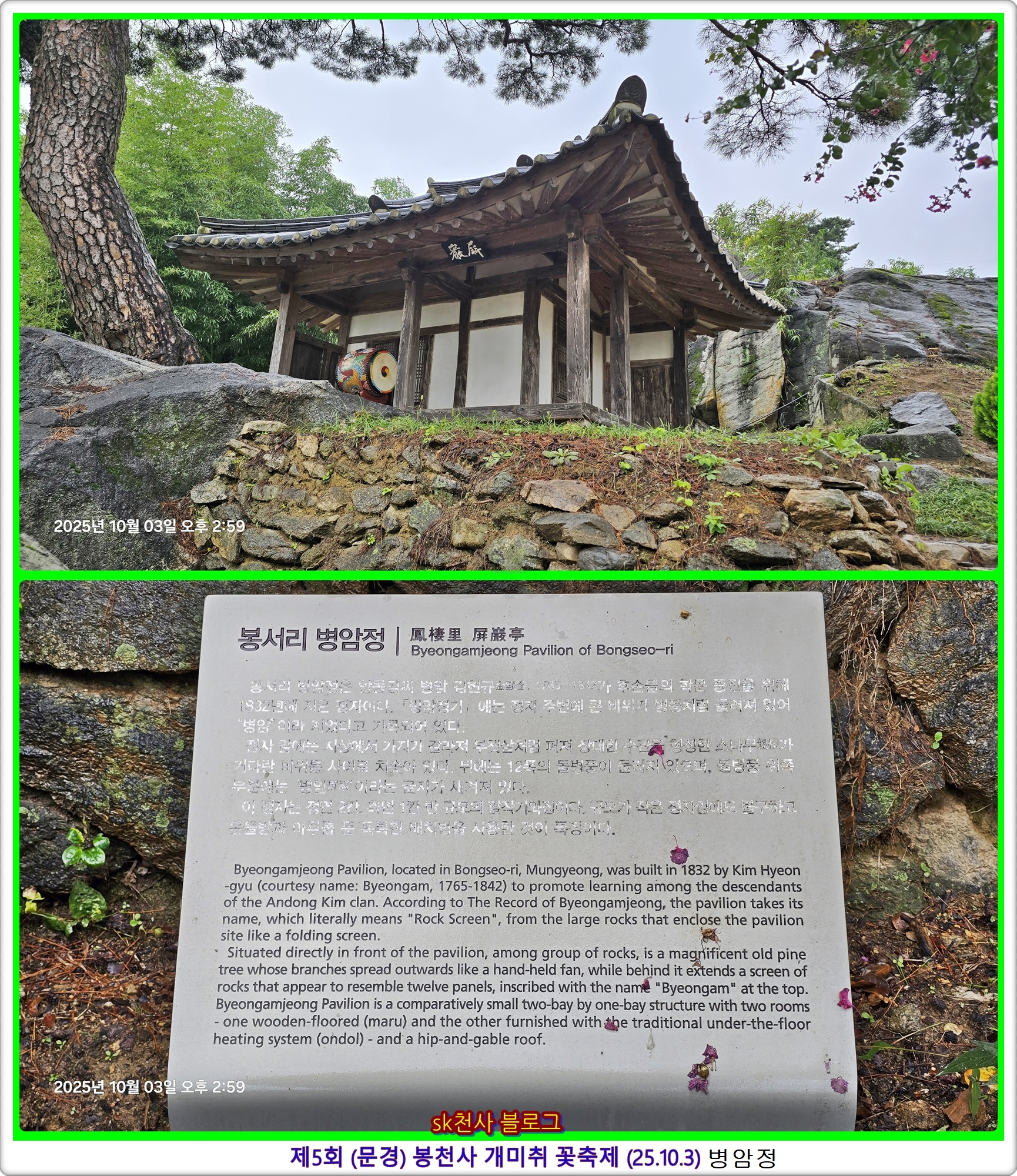 ↘ 조선 중기 유학자였던 병암 김현규(1765~1842)가 1832년 세운 봉서리 병암정과 병암정 앞 수령 400년 정도의 소나무 보호수