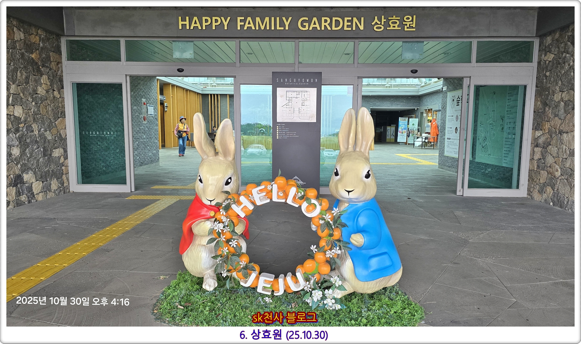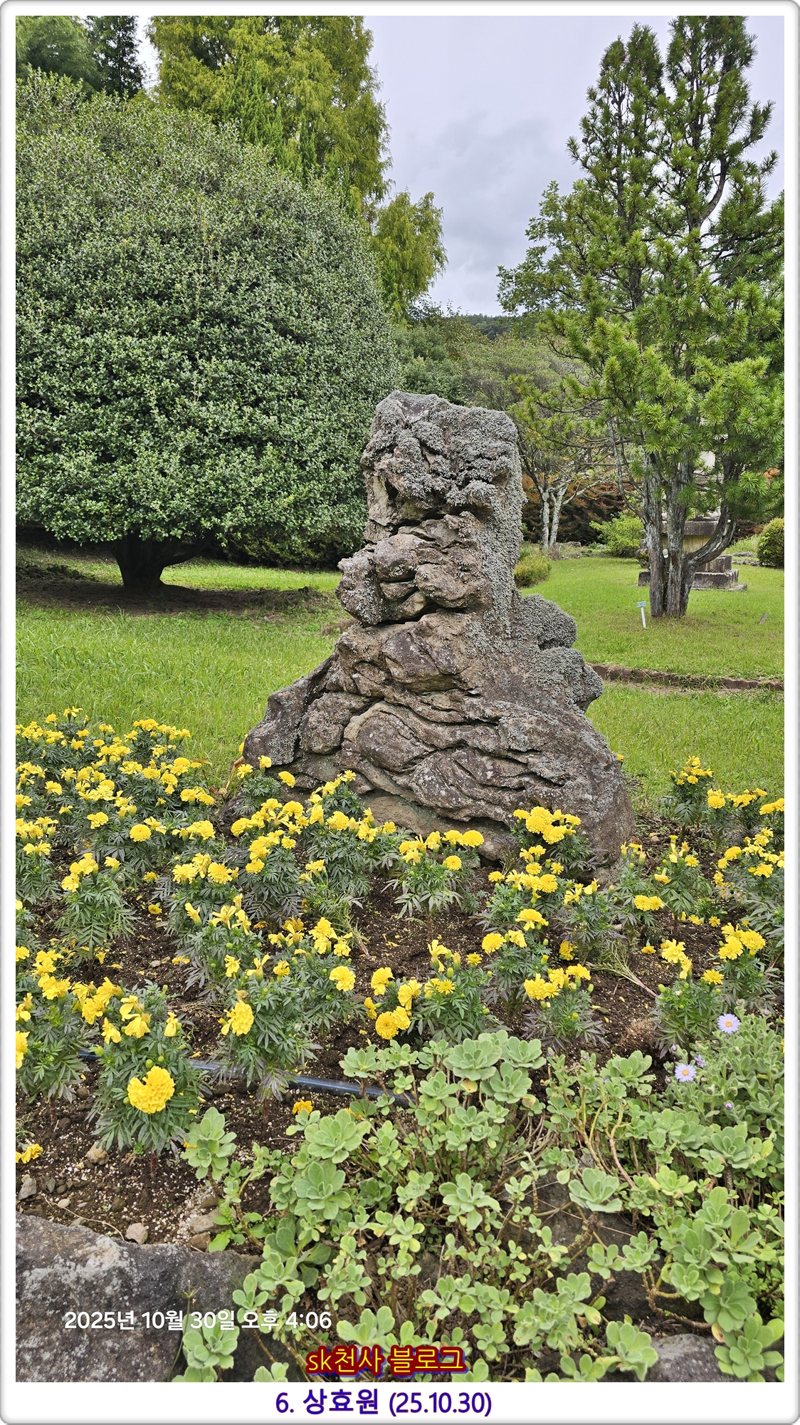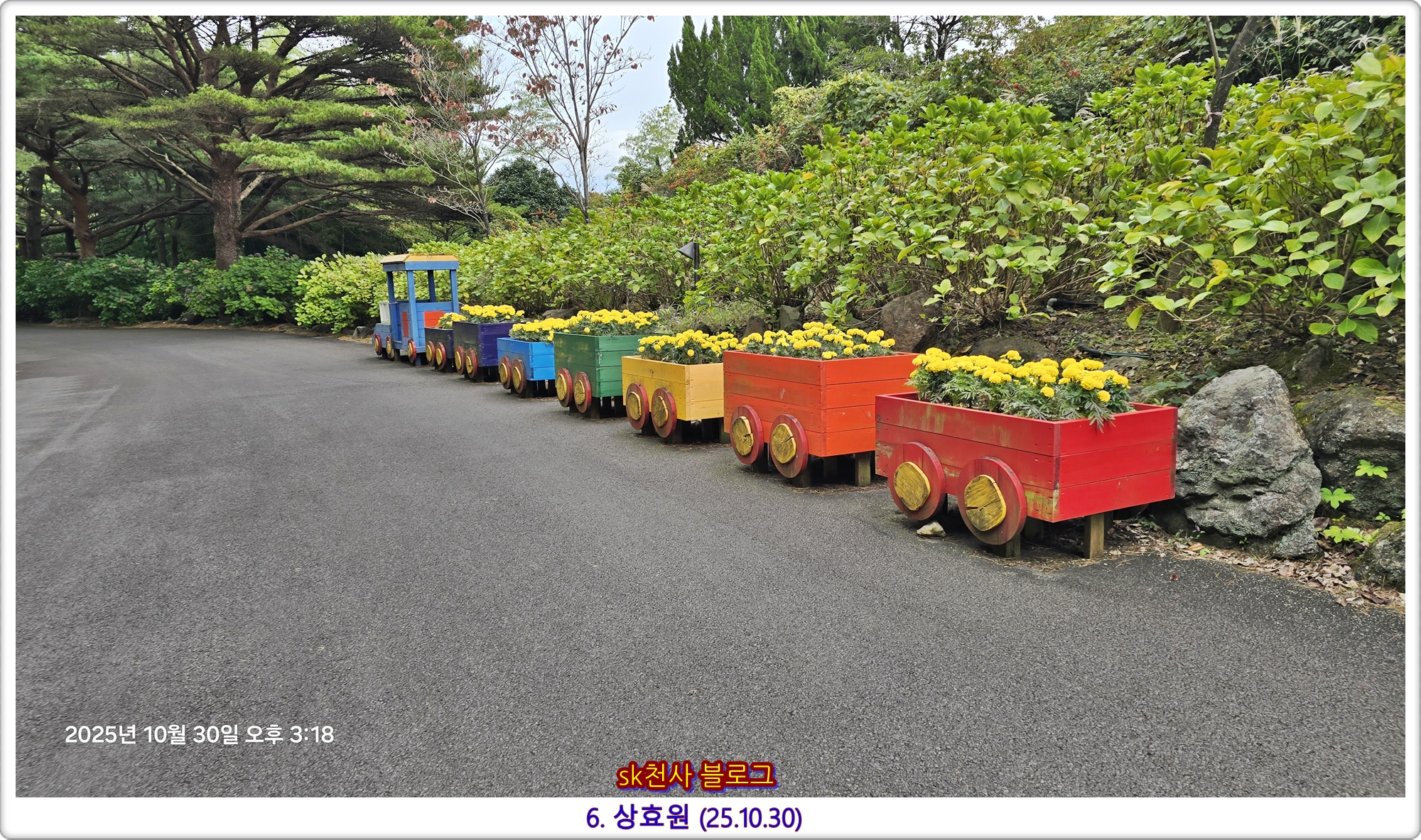 * 상효원 수목원 (Sanghyowon Botanical Garden) : 이곳은 자연 속에서 천천히 산책하며 힐링하기 좋은 제주 대표 수목원으로 2007년에 개원한 민간 수목원으로 설립자는 '이달우'라는 분입니다. '상효원(常曉園)'은 '언제나 밝은 정원'이라는 뜻을 담고 있습니다. 요금은 일반 9천원, 경로 7천원이고 주차료는 무료이며, 상효안 안에 들어가서 맹꽁이관람차를 타고 수목원 내를 관람할 수 있는데 요금은 일반 5천원이고 단체는 3천원입니다.