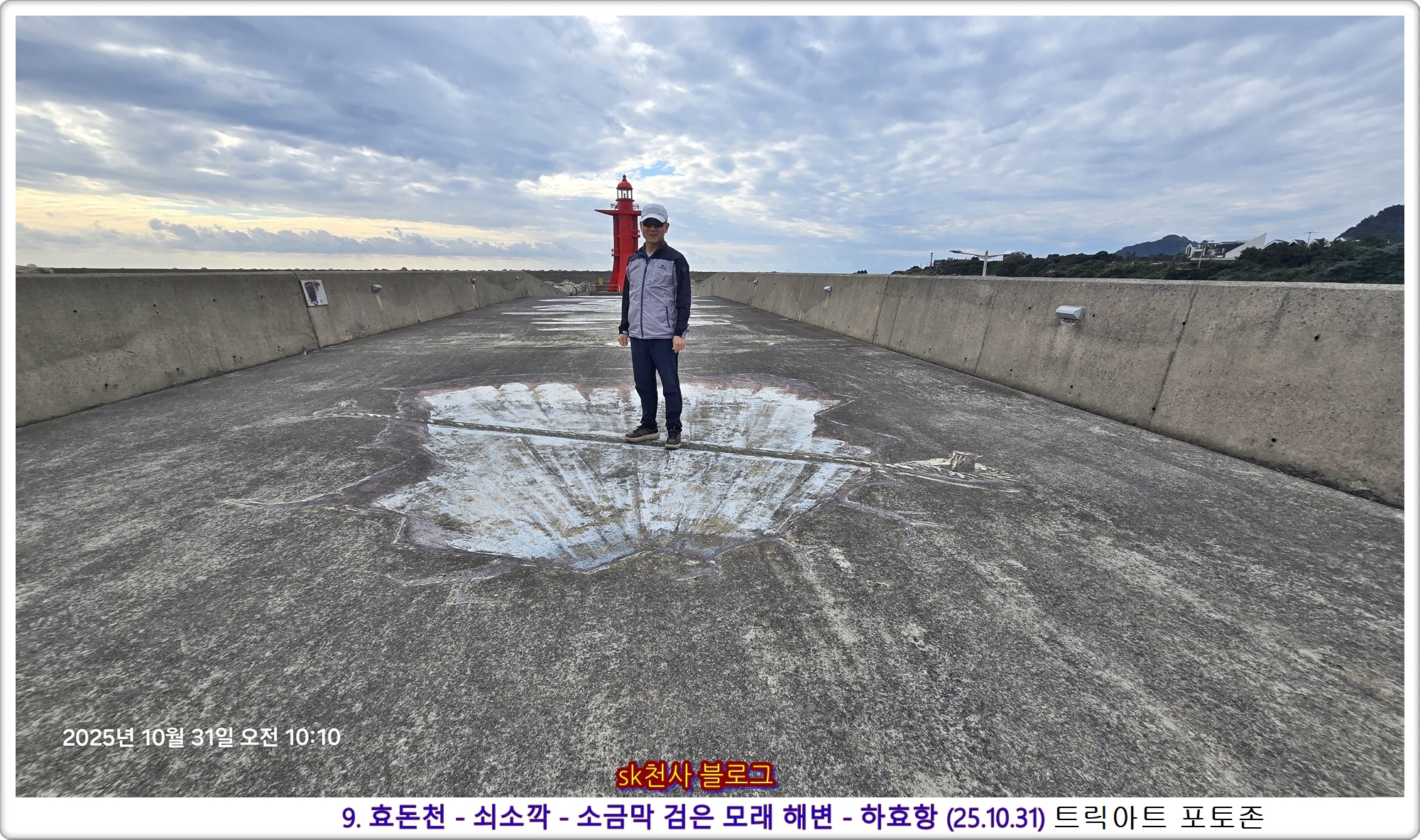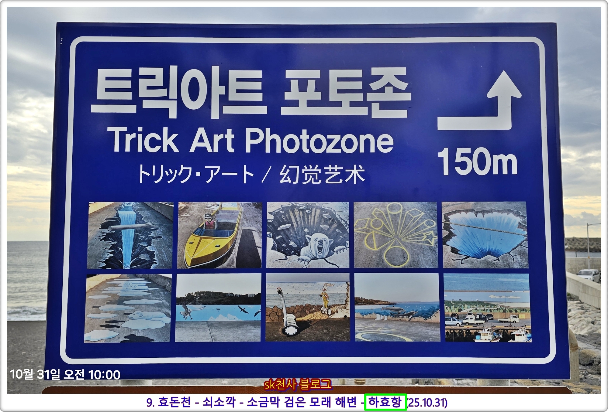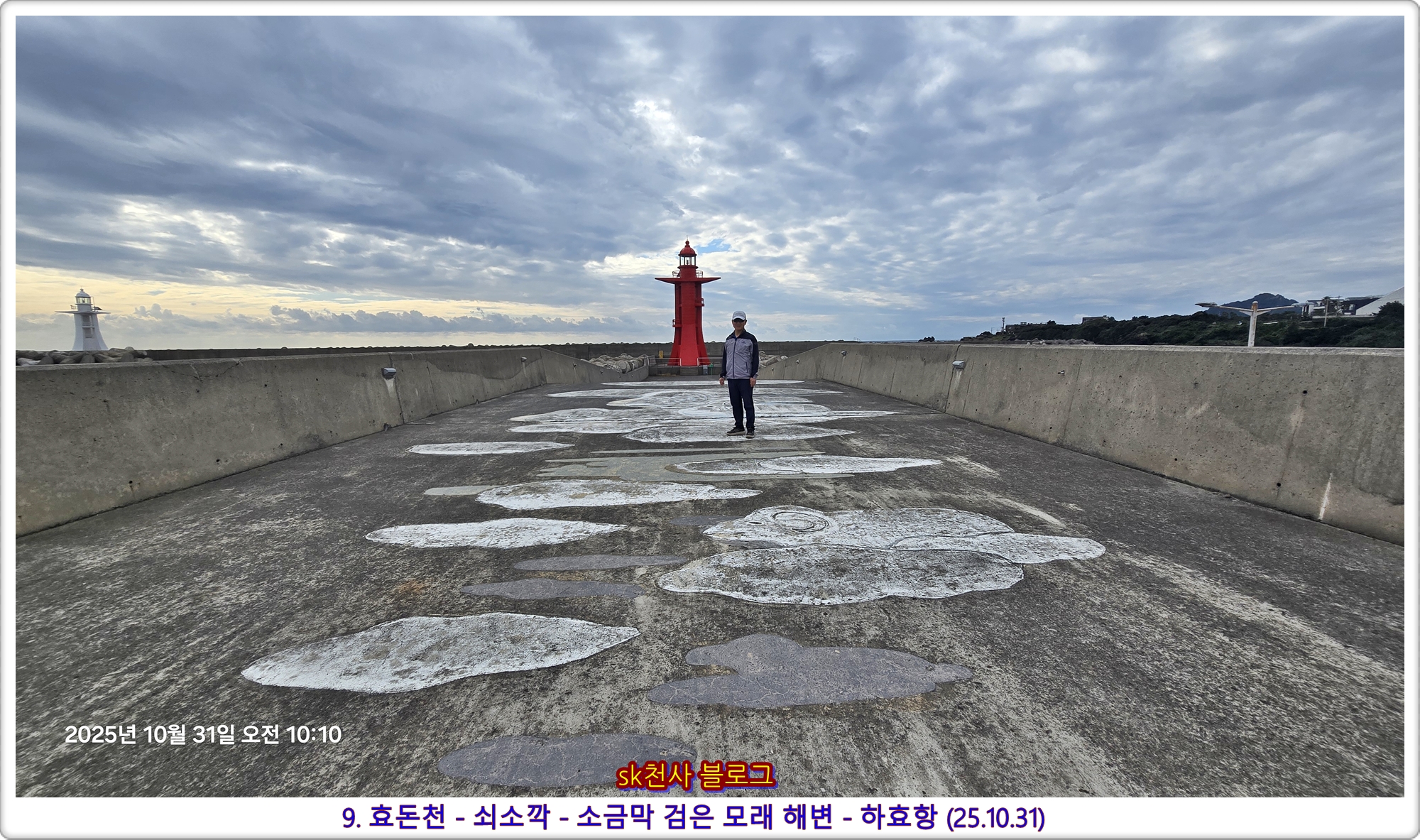 ↘ 효돈9경 트멍길에서 제7경인 소금막 검은 모래 해변과 8경인 하효항(등대)