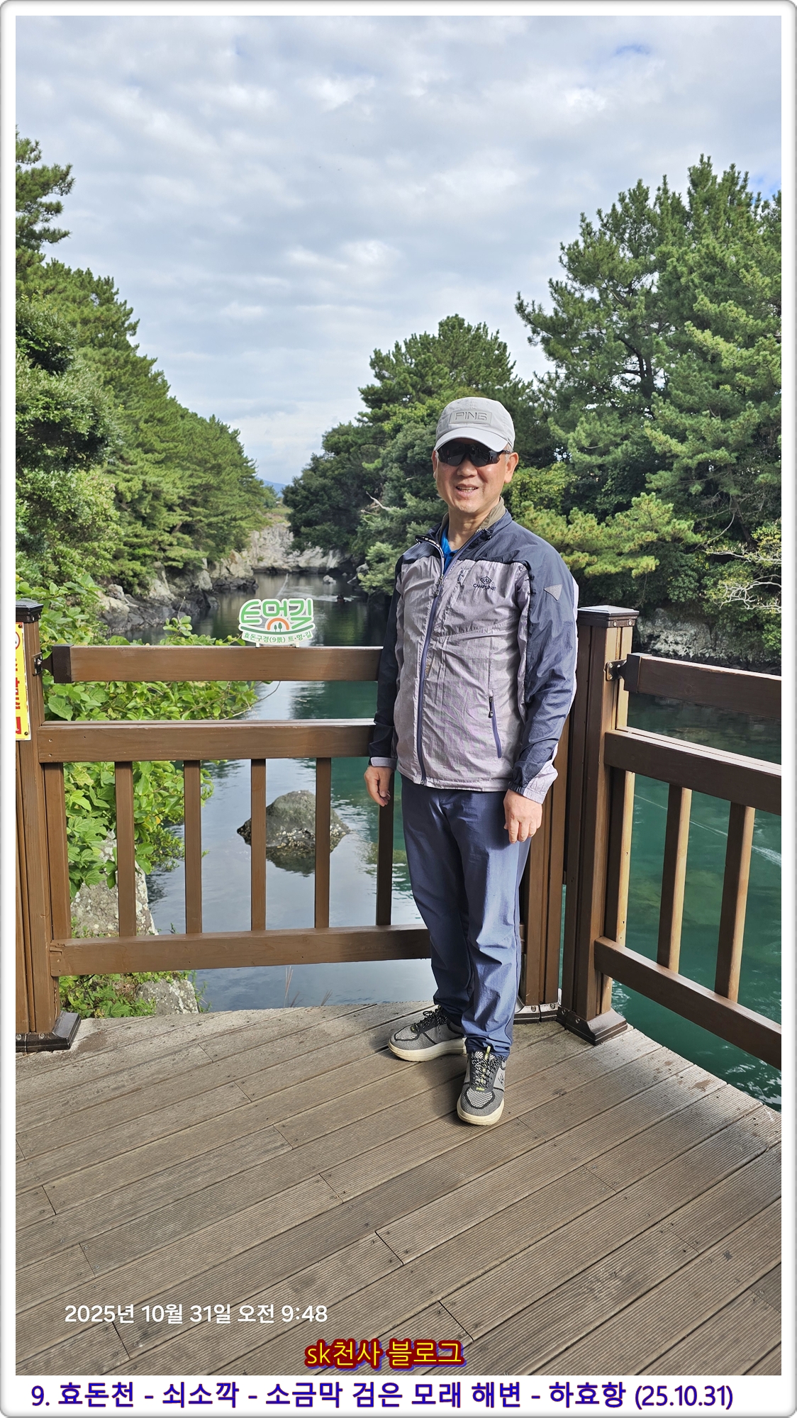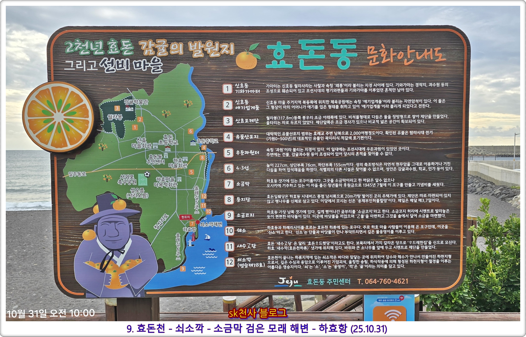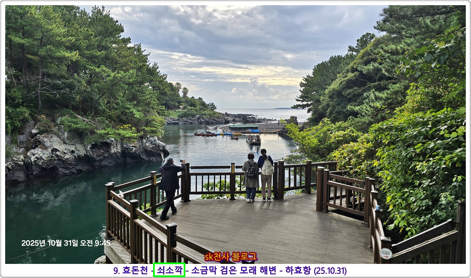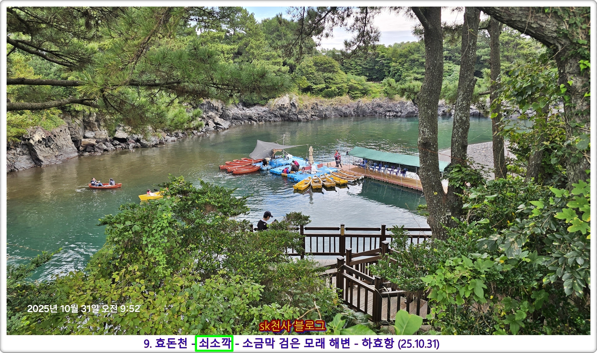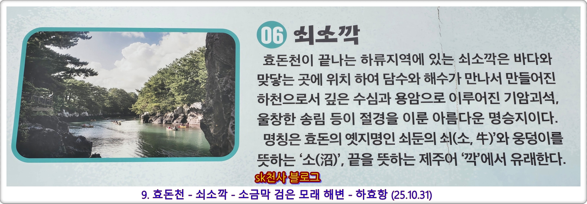 ↘ 효돈9경 트멍길에서 제6경인 쇠소깍 안내. 쇠소깍의 평균 수심은 3 ~ 4m 정도이고, 길이는 약 250m이며, 물의 색은 에메랄드빛을 띠고 있습니다.